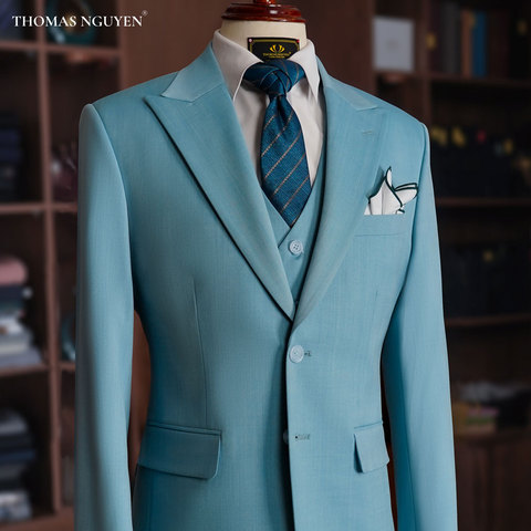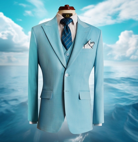 Custom Men Suit 3 Piece Suit Business Casual Suit Tailored Sky Blue Suit Jacket, Trousers and Waistcoat Natural Color Collection